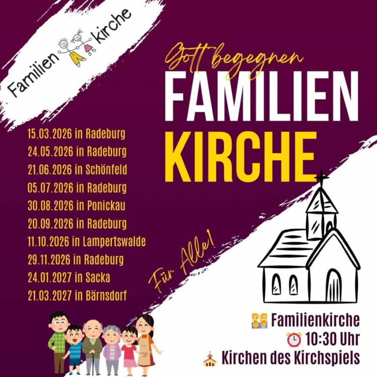 Familienkirche ist ein Gottesdienstangebot, was klein & fein gehal-ten ist. Dauer: ca.35 Minuten, mit schönen Liedern & kl. Ritualen.
